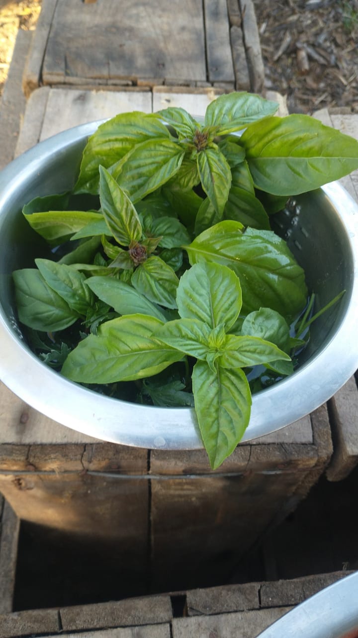 atado de albahaca fresca recién cosechada. Producto 100% agroecológico, desde la semilla hasta la cosecha. También tenemos albahaca morada pero poquita, si querés probarla, manda mensaje con el pedido y agregamos unas hojitas de esa variedad!